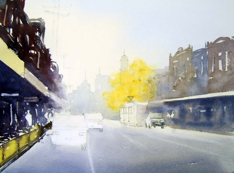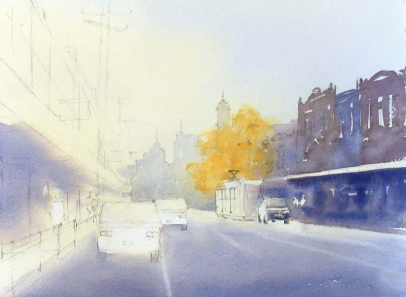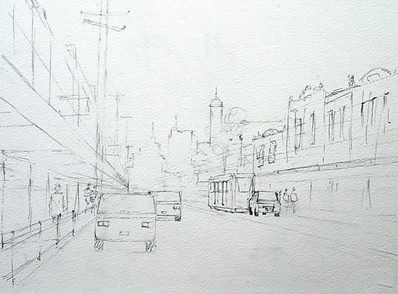 注意在图下面,我调整我觉得添加到总体设计的图像如。我把电车和汽车在路的另一侧,使道路有点窄。我删除了一些树木的右边和简化了那里的建筑。当我做这样一幅画我不坚持完全的是什么照片或现场在我面前当绘画从生活。如果我想要一个图像与一切是那么我不妨就架我的照片。相反我做出调整,我觉得会给消息我想传达用最少的笔触和绘图。在这种情况下我想展示的是日落与人毫无疑问在他们回家的路上,经过几天的工作!
