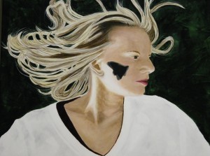 As I went, I used raw umber to shade and white to highlight and the gold to add yellow tones to both the face and hair. About this time I also started shading in the folds of her shirt. I used different shades of gray for this