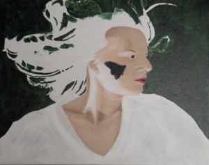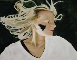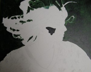 I used green for the background. I did it in two layers. The first was a lighter covering and the second a thinner, darker glaze of the same color which I layered plastic wrap on to give it some texture. I then blacked out the butterfly and started on the skin tones.