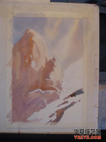 3。我工作在140磅。拱门冷压水彩画纸,这是我最喜欢的纸给规模较小的工程。我湿的天空区域第一,然后滴在我的颜色使用第一黄色赭石然后镉红灯,其次是深蓝色,这给了我温暖的灰云的影子。因为它开始干我块大岩石群众。