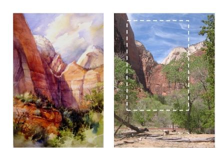 3. Instead of worrying about the foreground, with all its interesting fallen logs and shrubs, I raised my view to the place where the afternoon shadow started to crawl across the cliffs of Heaps Canyon in Zion. By leaving out the foreground I could move the viewer quickly to my center of interest. This was painted on location as part of the "In the Footsteps of Thomas Moran" plein air invitational competition in Zion National Park.