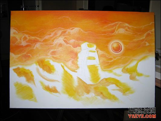 我建立基地的颜色通过添加更多的黄色,红色和橙色,与大轮海绵刷混合在一起。然后我开始添加云使用正常刷和较轻的黄色。