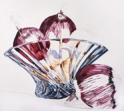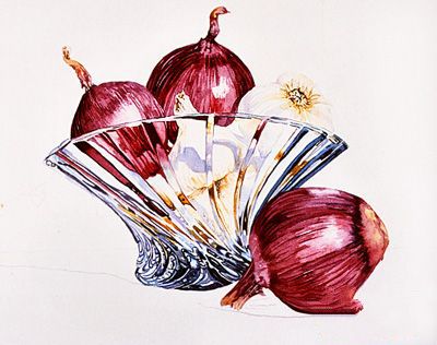 10油漆外面的洋葱的黑暗值使用洋葱dark-to-light方法将帮助定义他们的形状和纹理。混合暗红带着一丝Phathalo绿松石。使用no。6轮,遵循洋葱的曲线作为你画在最黑暗的值。11油漆洋葱的中值