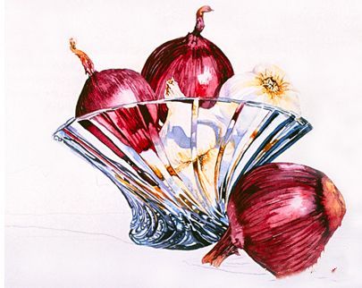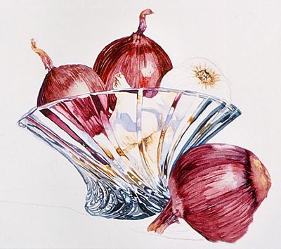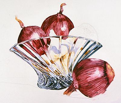 一旦背景十分干燥,油漆的阴影。背景阴影是相同的色素的混合物。桌面背景有一点灰色,所以添加永久性Alixarine深红色,并添加水影子有点轻。添加更多的永久茜素深红色甚至得到一个灰色的阴影下的影子洋葱。