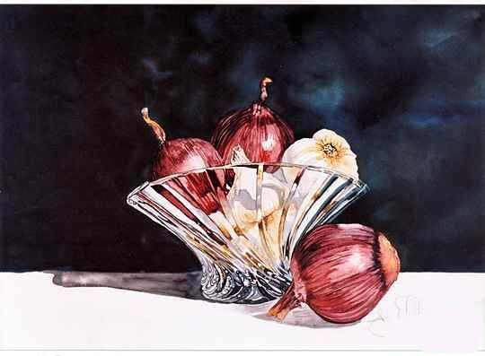 现在玻璃块完成后,您可能会调整一些工作值或玻璃在一些地区。最好是如果你等待,完成背景、阴影、洋葱和大蒜。完成这幅画的其余部分将给你更多的信息,你可能会或可能不会需要添加这些细节。