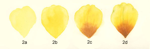 注意:它可能有助于把纸颠倒,底部或黑暗部分的花瓣是转向。这使得色素跑向外缘。不允许覆盖整个花瓣色素。你想要一些Aureolin内部边境新藤黄或边缘保持。