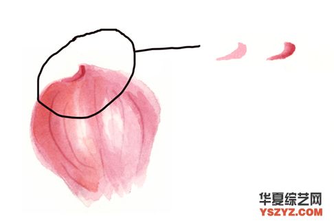 6)添加新月形(如下例上看到右上角花瓣)在随机使用永久性的玫瑰花瓣。为此,运用笔触湿干在新月的形状。干燥时,重复深值。