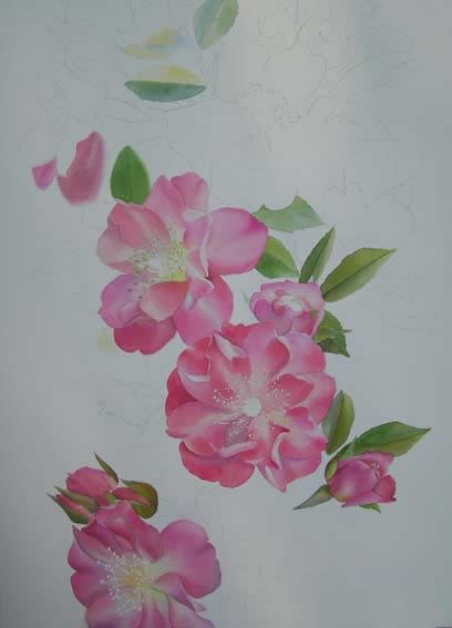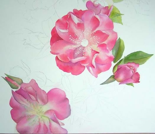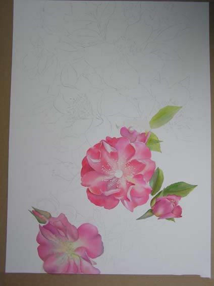 提示:尽管我做光underdrawing之前我总是擦除线开始添加第一层的颜色。我不喜欢看到铅笔线后着玫瑰。当你做了第一层的颜色很难抹去。所以让他们好和光线。我将展示一个完整的版本的绘画和一些亲密的ups。我仍然需要软化一些边缘和我必须添加也许更偏暗的叶子。我也会重新在一起看看,看是否我很满意,需要更多的偏暗等。还有很多事情要做,我希望在接下来的日子里取得很多进展。
