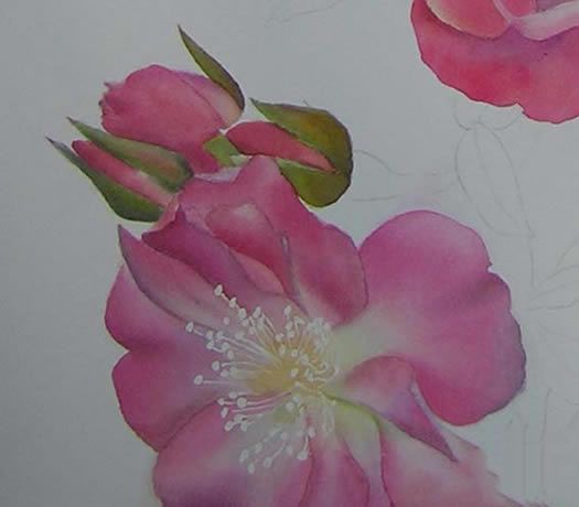 然后我开始在玫瑰的底部画。因为这玫瑰不在感兴趣的中心,我比其他玫瑰颜色冷却器。我工作更多的和永久的玫瑰,亮紫色,绿色颜料,大红和酞青蓝。我还用Aureolin,这是一个很酷的黄色。我也愁白了颜色,所以这将不是一个竞争上升到另一个。我还有软化边缘。在第一张照片,你将看到一个近距离在接下来的照片,你会看到整个绘画,所以你有一个好主意,我工作。