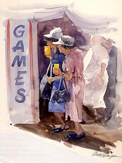 这些女士都喝柠檬水在一个非常炎热的一天在当地县集市。我发现背光是戏剧性的,有趣和简单的形状。