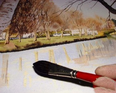 允许最后一幅画完全干燥。现在应用掩蔽流体结束画的树树干反射来保护他们免受未来洗。此外添加的液体,会保留一些光奇怪的水平条纹彩色纸和将在表面看起来像波光粼粼的波纹。然后允许掩蔽液完全干燥。现在使用的拖把画笔湿清水 wnole 河的水地区。轻轻地刷所以油漆不受到干扰。