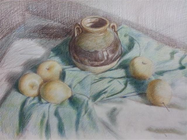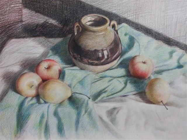 照片描述:将画面中最多的颜色根据对象的形态特征,颜色轻重沿着形体转折线均匀着色。注意它对周围物体的影响。至于为什么把绿色的布画成了蓝色,请看下一个步骤。