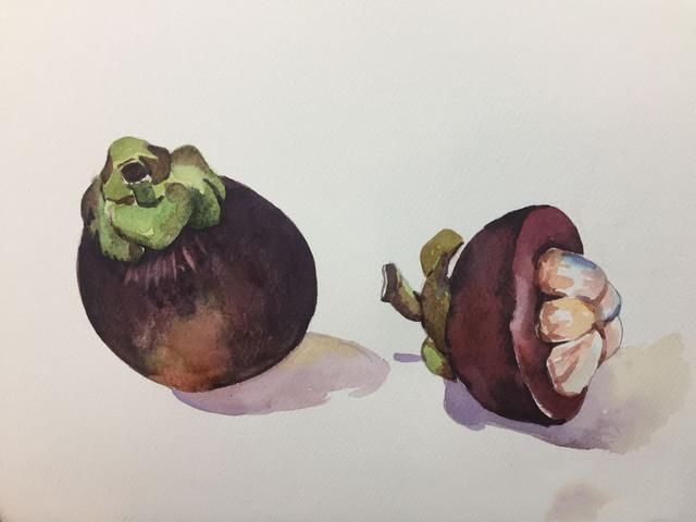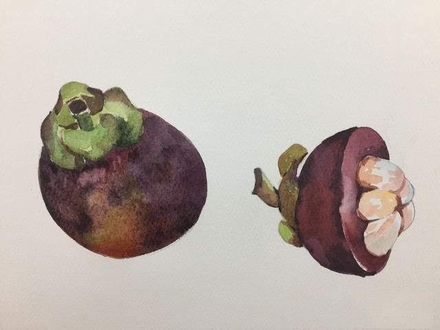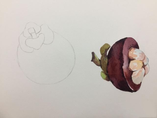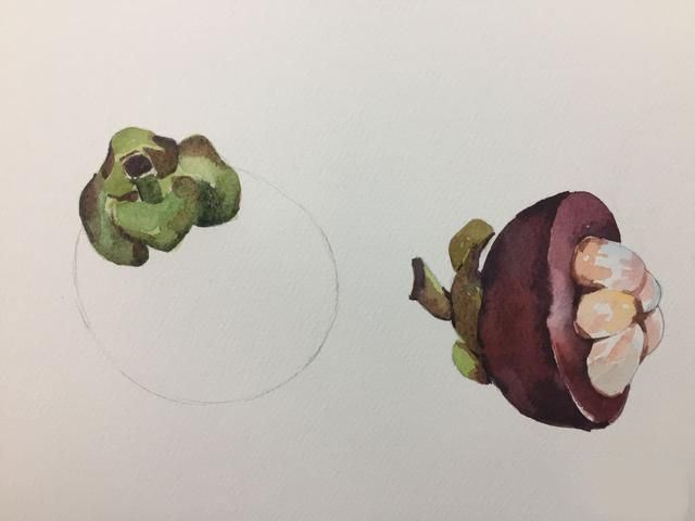 先画出半个山竹,注意绿色的运用和山竹果肉的颜色