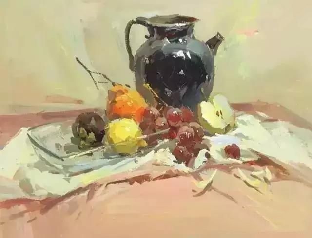 水果总的特点是颜色丰富,色彩纯度较高,表面光滑。作画时要注意水果的素描关系和体积感,把握好色彩的水分,表现出笔触,塑造时多用色块表现。