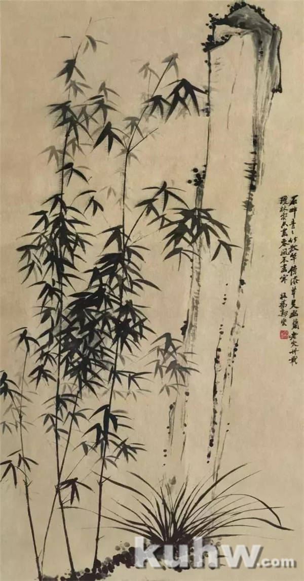 竹—不是木本、草本,藤本;画大竿要求笔力刚健,正气磅礴。直线微带弧线,表达竿的弹性。画枝形态要求与竿成三角形。表达瘦挺。大叶小叶,长枝短枝,枝枝叶叶均以三角形丛丛配合。画面空处,皆以三角形组成。叶的传统名称很多---有横舟、偃月、片羽;两叶的叫法有;人字、娥眉,鱼尾,三叶的有;金鱼尾、燕尾、飞雁,四叶的有;落雁、惊鸦。