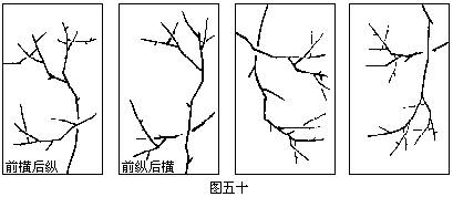 纵横交错法:梅花纷繁多姿,有上发、下垂、横倚和回折等,在构图时可将两种发枝式组合到一个画面上,形成纵横交错。其变化很多,可以前横后纵,也可前纵后横。可以用左横枝交错,也可用右横枝交错。至于“S”、“之”等形式的梅图,实质上都属纵横交错式范围之内,只是交叉时角度有大小运用不同而已。