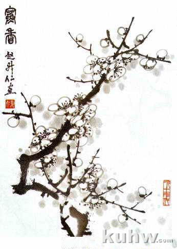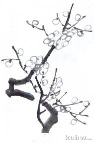 画圈梅,一般不着色。为托出白花,可在花瓣轮廓外围圈染淡墨。也可用淡赭石或淡草绿圈染。圈染时水分要足,力求渗化效果,切忌干涩、刻板。圈染后可再用较大的笔,加水调和成更淡的赭石或草绿,点洒于圈花或枝干间隙,(点洒时要有疏密,不宜过多)使画面层次更充实多变,总体气氛更好。花心处一般留白,或点黄粉。