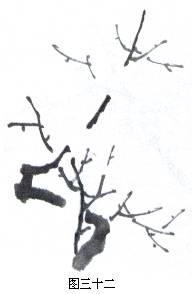 第一步是出枝。先用笔蘸调淡墨,在盘子边上括干些,再蘸深墨,以中锋画出最前面的枝条。起笔时用中锋,画至枝条下端渐转侧锋,务必注意行笔过程中,枝条留白断开,以便填花。也可先用较淡的墨,以侧锋画出后边的粗枝干,再加前面深枝条。要根据构图需要灵活运用。无论那种方法,枝干的穿插交错、疏密关系和断开留白等都是一样的。
