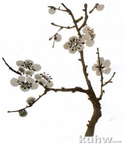 点墨梅,是用淡墨点 梅花。方法是用秃笔先蘸淡墨,再蘸适量较深的墨,然后按花的正侧偃仰背,以中锋垂直点下。花朵分布有疏有密,点要圆,不露锋,花瓣墨色有浓淡,使之有立体感。花心、花须、蕊头、花蒂,要用浓墨在花瓣将干未干时勾点。最后,在枝条上加苔点。