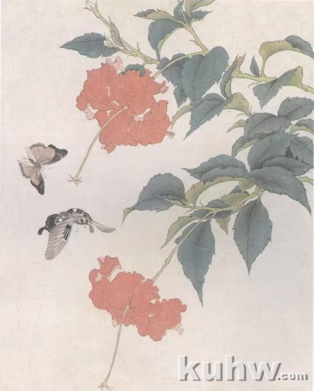 步骤三:用胭脂加赭石及藤贡分染蝴蝶,草绿加墨平涂叶。