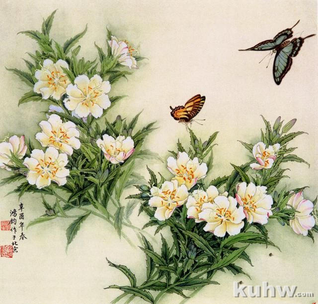 步骤五:深入刻画蝴蝶。石绿点眼,白粉加藤黄点蕊,朱 分染花头反瓣,调整画面整理完成。