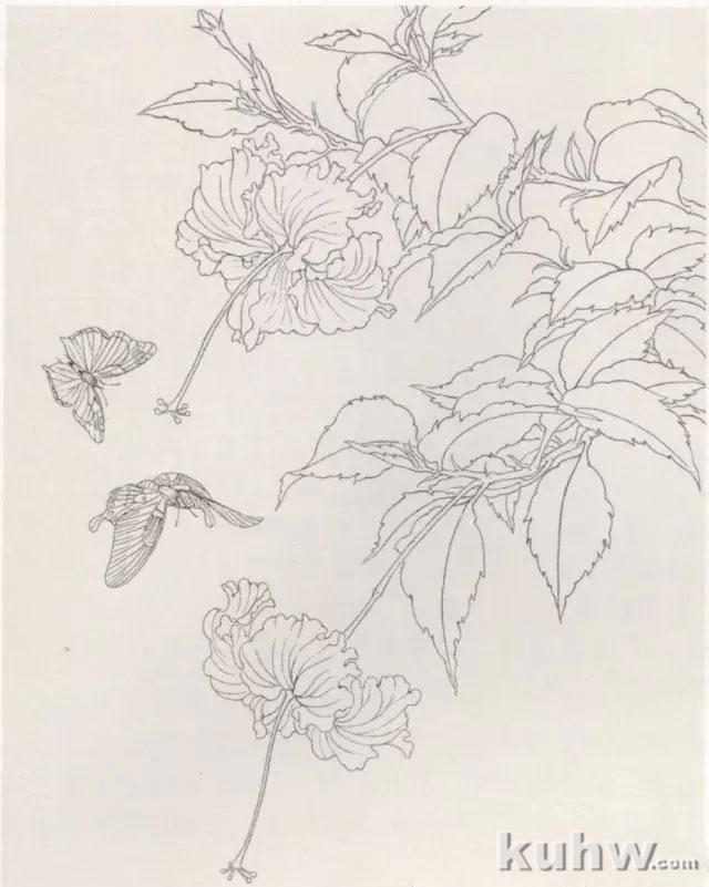 步骤一:用重墨勾头、胸、腹、足,中墨勾翅膀,浓淡墨勾背景花卉,注意构图布局。