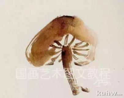 步骤四:在香菇柄与香菇身之间连接处,用淡墨调赭石画出香菇底部辐射状形态,注意墨色略淡。
