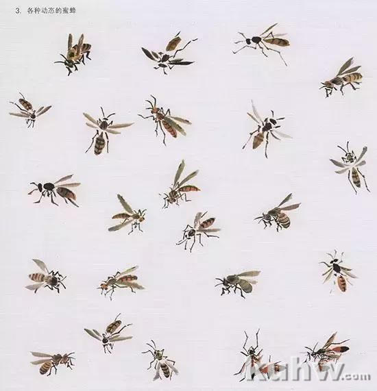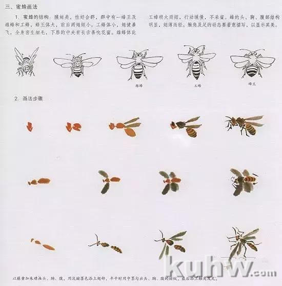 中国国画技法—蜜蜂的结构:膜翅类,性好合群,群中有一蜂王及雄蜂和工蜂,蜂王体大,前后两翅短小。工蜂体小,翅健善飞,全身密生细毛,下唇的中央有长舌善吮花蜜。雄蜂体比工蜂稍大而短,行动缓慢,不采蜜。蜂的头、胸、腹部结构明显,翅薄而轻。触角及足的动态要着意描写,以显示其美。