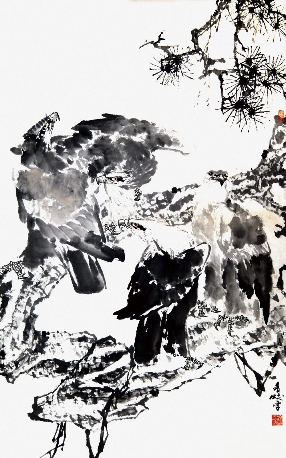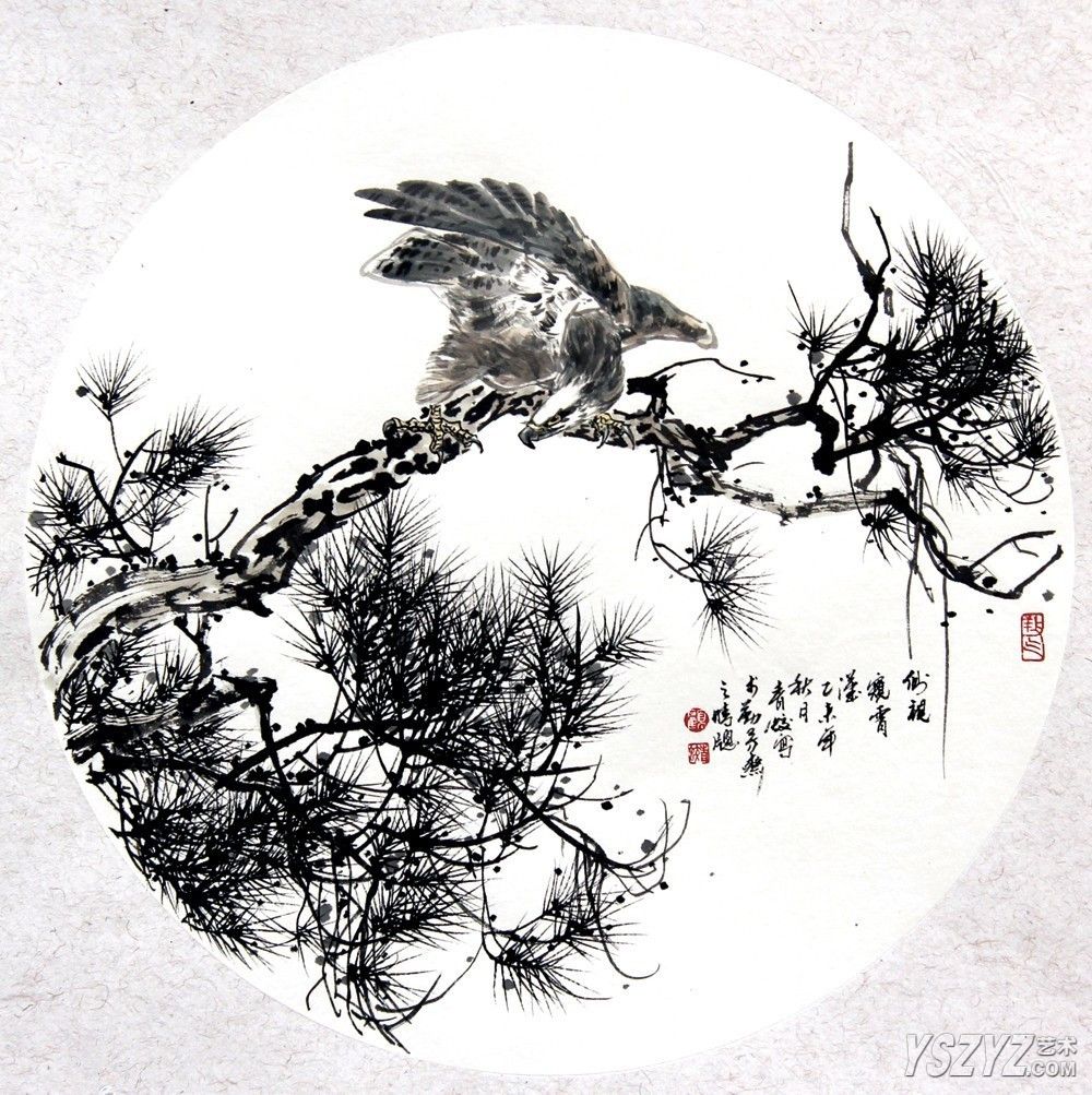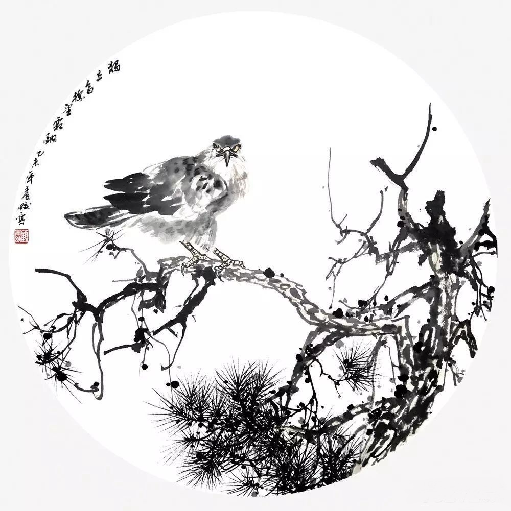图四《侧视窥霄汉》、图五《独立高标望霜翮》这两幅松鹰图属圆形小品画,作品虽小,但气局很大。两图都是取松的一枝,曲干折铁,笔墨纵逸、雄健。所画之鹰,或振翮侧视窥霄汉,或独立高标望霜翮,刻画出了鹰的雄霸之气和松的劲节之韵。