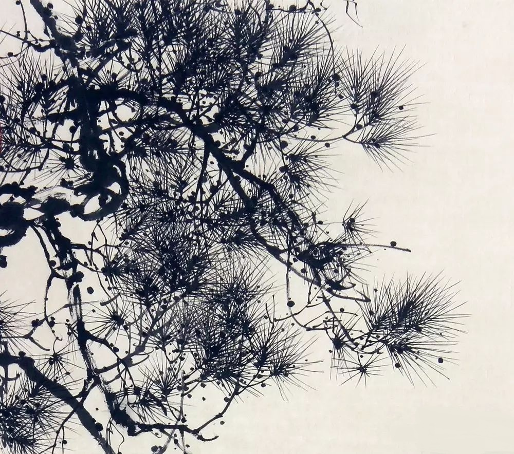 松根长在平地上一般是不见根的,而生长在山崖间的松根为了吸收水分营养,根会外露延伸并形成盘根错节之状。表现松树皮时可圈成不规整椭圆形,用笔需遒劲浑厚,用墨要稍微浓重些。画树干时可将勾画树干结构和圈点树皮同时进行,使两者自然配合。在阴暗交叉部位可加点墨苔,以体现松树本身具有的苍老感。