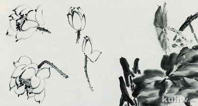 3、用墨色画花梗和叶梗时,要做到花重、叶重,梗也随之而重;花淡、叶淡,梗也随之而淡。梗的变叉应避免出现垂直线和平行线,相交角度也不要过大,要有长短、粗细、浓淡、枯湿的变化。