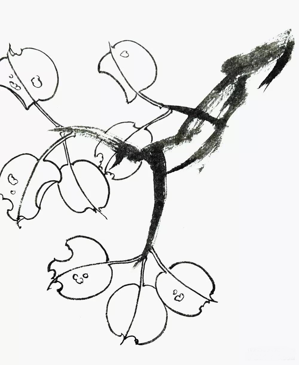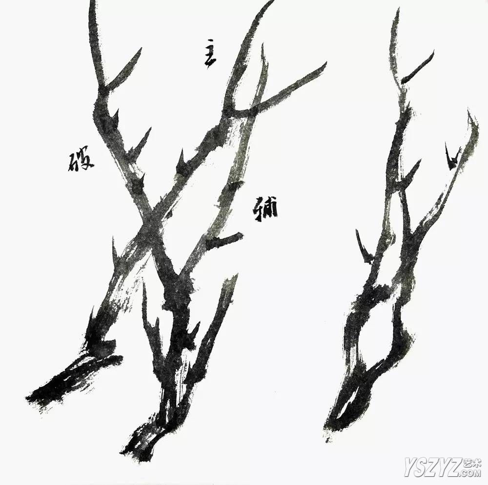 其实这也是古代哲学思想体现在中国画美学观念里的一种相反相成和相辅相成的辩证关系(“相反相成”见于汉代《汉书·艺文志》,“相辅相成”见于明代《历书眼序》)。文学和哲学是先于绘画而发展和繁荣并深刻影响着中国画的理论和创作的,其中包括老庄关于“静”的美学思想。所以,如果不能领悟蕴藏在花鸟画笔墨中的哲学内涵,就不可能真正理解和把握中国画的艺术精髓。还需注意的是,画树枝的时候,用笔要涩,不要光;要稳,不要荒率;要肯定,不要犹豫(见图二)。要表现出树枝特有的质感,既不能画得像根溜光的木棍,也不能类似毛糙的麻绳。