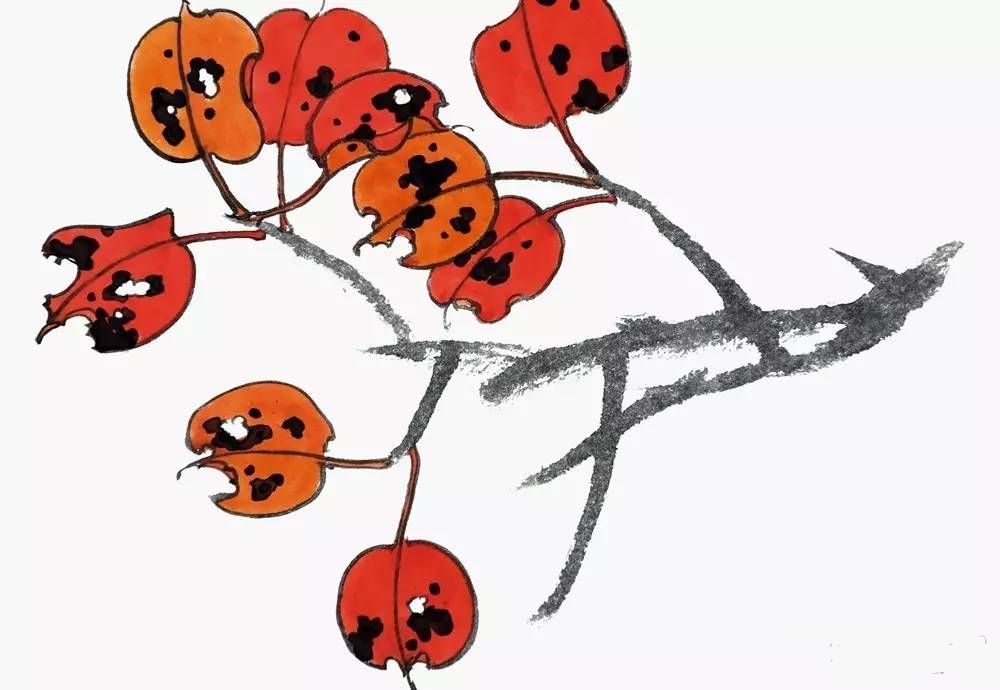 叶子背面用赭石略调朱砂即可。需要注意的是,正反面叶子的颜色不宜反差太大,否则画面则嫌跳跃,而且呈反面的叶子不宜太多。画叶片上的虫食斑以胭脂、赭石再加淡墨即可。圈点虫食斑时,笔中的水头要大,圈点后纸上要汪着水,待干后斑痕边缘应该留有较深的水渍,这样的效果是比较理想的。如果所画虫食斑较大,可以在斑痕中间再酌情复点稍小的斑点,以使画面更显生机、活力(见图四)。