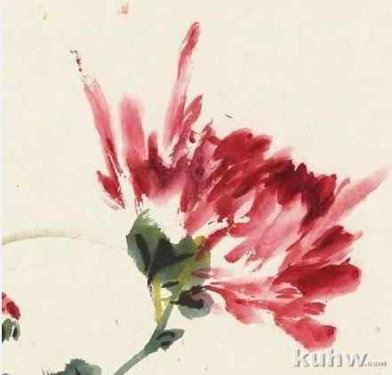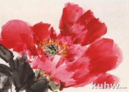 王雪涛写意牡丹第二步,笔蘸洋红合胭脂,中侧锋间用,点画花心部位,烘托出前边浅淡部分的花瓣,再以渐淡颜色,依次画出外层花瓣。要画得疏密交错,大小相间,层次分明,切忌平均排列。画两个花头,姿态正侧、颜色深浅要有所区别,不能雷同。三个以上的花头,注意疏密、大小、藏露相间。