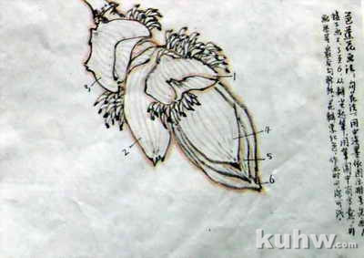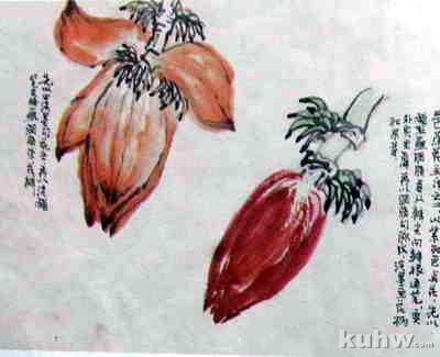 勾芭蕉花,可用淡墨,按照花瓣的前后层次来画,要求用笔有变化,花瓣的外形用线略粗于脉纹。点法画芭蕉花,可用清水笔先蘸淡赭石,笔尖再蘸胭脂由瓣尖向瓣根处运笔,瓣与瓣之间要适当留出空白。显出花瓣的层次,再以略重胭脂勾脉纹。最后以淡墨勾花梗和果实。