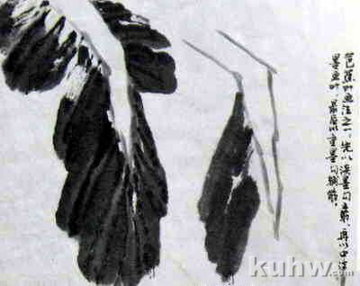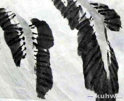 点画法芭蕉叶应用较大的羊毫笔为宜。先以淡墨勾主筋,以中淡墨阔笔铺叶,再以重墨勾羽状支脉。画时要考虑叶子的外形,铺叶时不要与主筋靠的太紧,应有虚笔,支脉不要画得平行,应有变化。