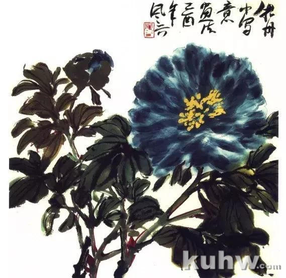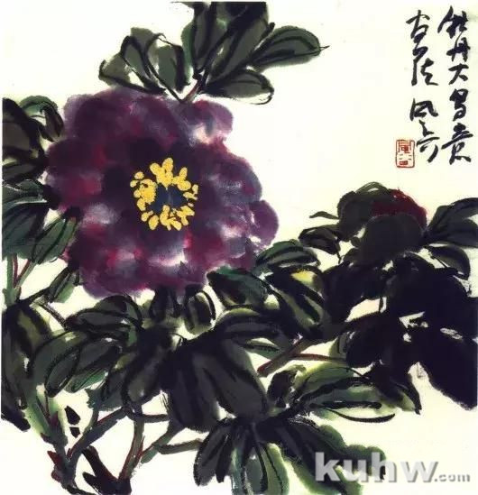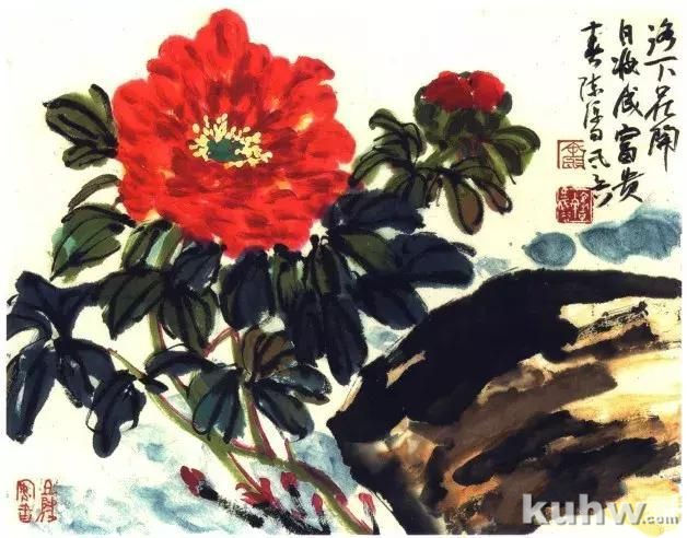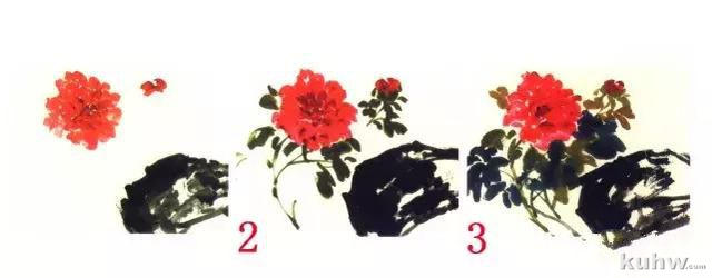 1.水墨画石,曙红加少许藤黄,画花冠一朵和不上花苞聚瓣,注意三元素的空间比例。