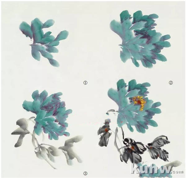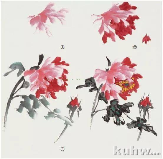 ①用含清水的羊毫笔,笔尖蘸淡墨先画出有长短、大小变化的背面花瓣。 ②用带原淡墨的笔尖蘸浓墨,使之笔尖浓笔根淡,侧锋 出牡丹正面花瓣,花蕊处为最浓。③用朱砂色点花的雄蕊,用石绿色点雌蕊,再以重墨画出花茎,用浓、淡墨画出叶片。④勾叶脉,收拾完成。