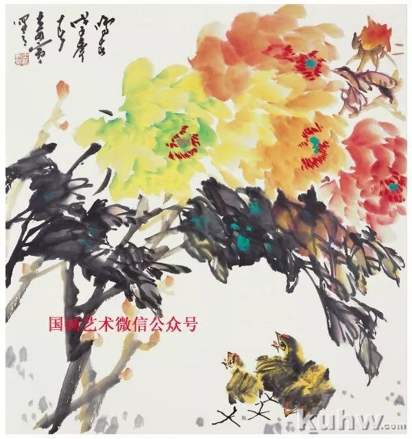 一幅好的作品在创作时如写文章一般,有起、承、转、合的过程,这幅画面的起势为一组花冠,承势为枝干,转势为右边的花叶,小鸡则是画面的“合”了,小鸡姿态和视线统一了画面。