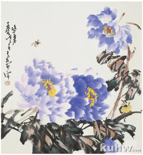 画面应该讲究其自身的呼应关系,如主、客体之间的呼应,色彩之间的呼应和物象动态之间的呼应等,这幅作品让花与花、鸟与蜂之间相呼应,相映成趣,顾盼有情。