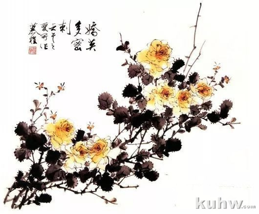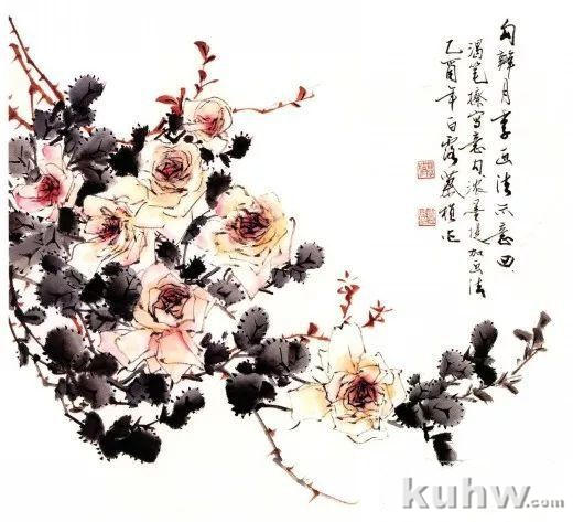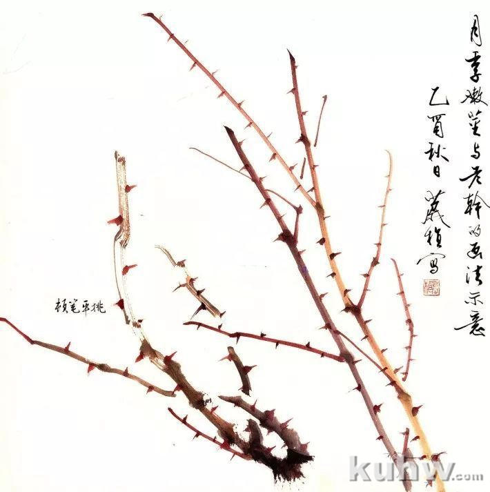 月季上的利刺用硬毫笔平挑而出,左右要错位,切忌平行对称。画竖幅、横幅等大的月季,构图上必须有主干,出笔要有主辅,二至三四干皆可。