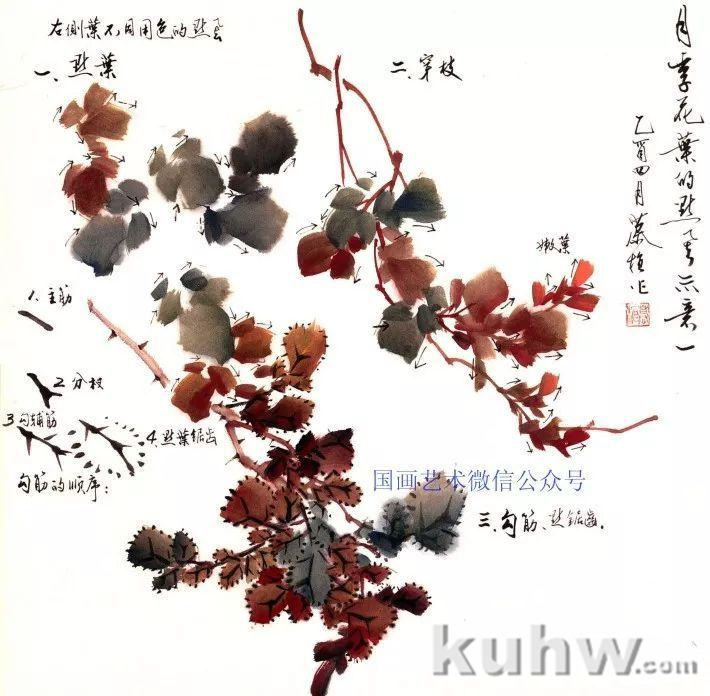 叶的筋脉,主筋一笔,左右侧的分筋一侧一至两笔,重色叶重墨筋,淡色叶淡墨筋,简洁为上。叶边的绿锯齿在勾筋后示意性地点出,其排列不必整齐。