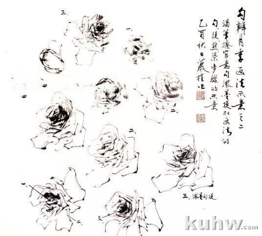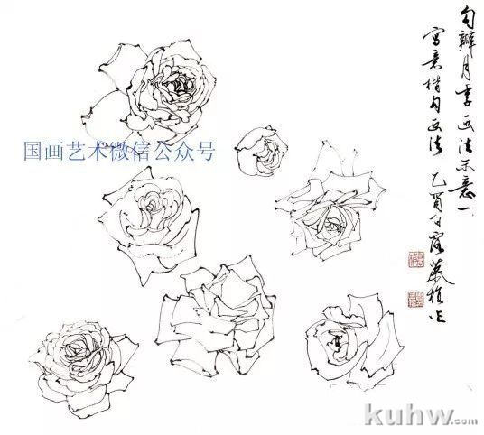 月季的意勾有两种,其一是写意的楷勾画法,这类楷勾不同于工笔的楷勾,是意笔的楷勾。笔法中融入了行楷的笔意,勾线有力度,有轻重起伏,画法首先强调的是花形结构,这是基于写实、写生基础上工写结合的一种画法。