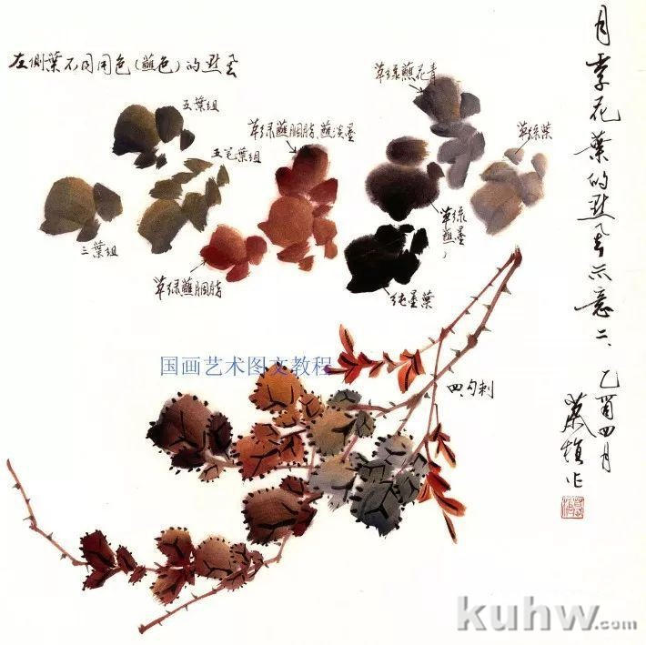 叶的用色上要避俗,浓淡墨叶的组合是一个好办法,但也不能把所有的月季叶都画成墨叶,还是要在调色、蘸色中想办法。叶的用色多以浓草绿蘸胭脂、蘸花青,胭脂蘸墨,花青蘸墨或纯墨色点 ,嫩叶的蘸色是朱 蘸胭脂,草绿蘸胭脂。叶组的穿插要注意朝向、大小、正侧、垂仰、用色浓淡和藏露、掩映、虚实的变化。更重要的是,点叶穿插叶组时,要留出穿插枝梗的空间。