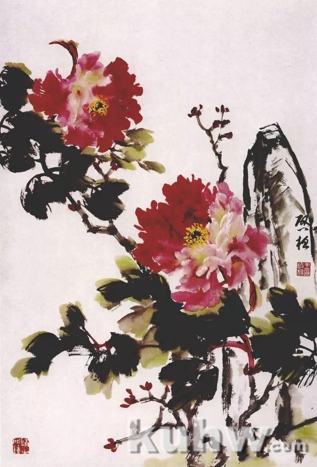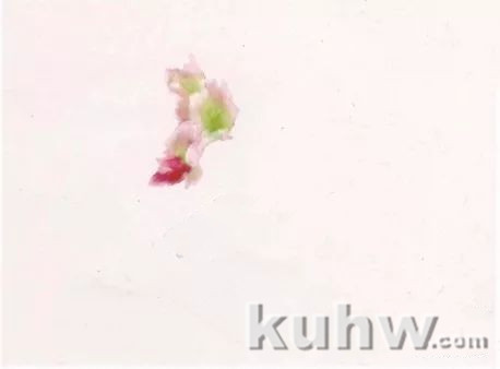 步骤一:用羊毫大笔蘸淡红色(牡丹红调胭脂),笔尖部蘸白,与淡红色略调,先画出牡丹花最前面的花瓣(即明部的花瓣)。花瓣根部点染浅绿(藤黄调三绿)。