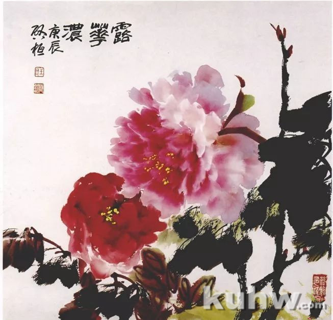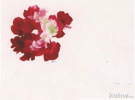 步骤三:用洗净的笔蘸深红(牡丹红调胭脂),画暗部的花瓣,注意外形的变化要潇洒,瓣根用笔尖蘸浓胭脂点染,使花瓣层次更清晰。
