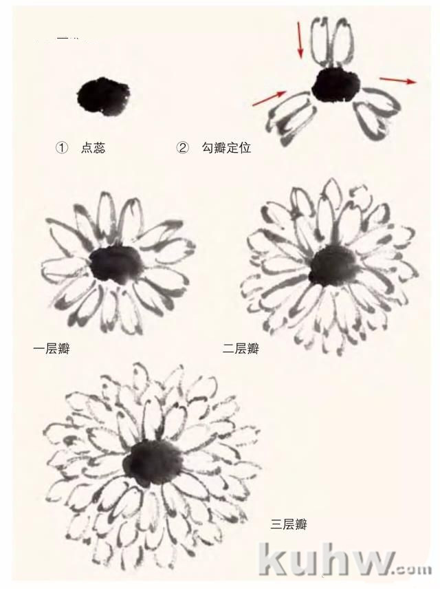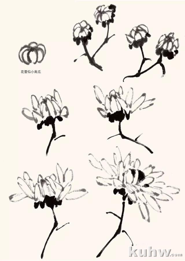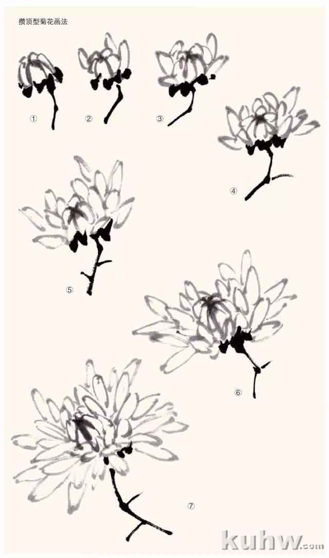 还有几种攒顶型菊花也可以用勾瓣的办法表现,但少有人画,我们不妨进行尝试。