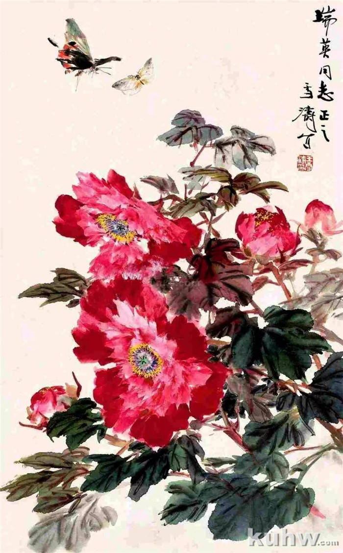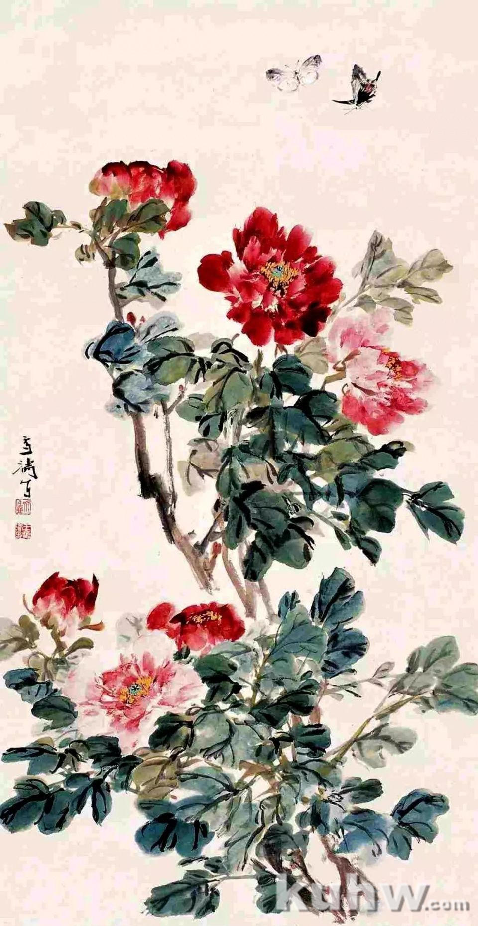 画牡丹花不能有干涩的感觉,要充分发挥宣纸渗化效果。花朵浓淡主要靠水分调解,不能过多依赖白色,一旦白色浓厚,行笔必然涩涕,腻而不畅,造成板结干燥效果。水分加大之后,行笔要快,趁湿完成,才能够使花瓣色彩分明清晰,滋润融洽。如果想追求丰富多变的花瓣形象,就必须在用色时中锋、侧锋,逆锋,拖笔等多种笔法并用,单一的点法,必然显得花瓣雷同。画红牡丹花,一旦配以绿叶,对比太强烈了,就使人感到俗气。为了使画面稳定而脱俗,就应该用水墨画叶子,压住火爆局面,取得视觉上色彩平衡。这样才能够“艳而不俗”。