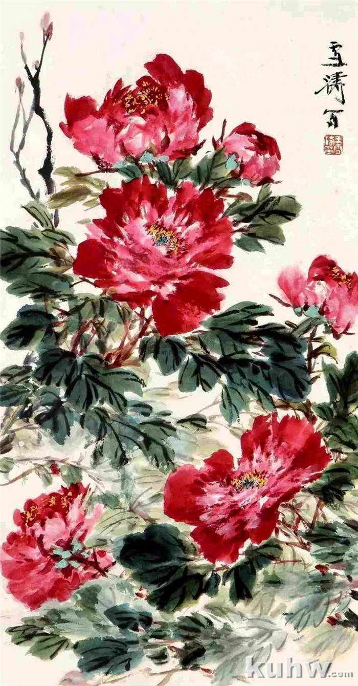 红花:用朱红、大红、曙红。以朱红为主调大红成基本色,笔尖醮曙红点画。也可以笔肚上足牡丹红,笔尖醮胭脂画出,色浓浑厚,要不,干了就显得单薄。