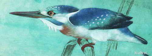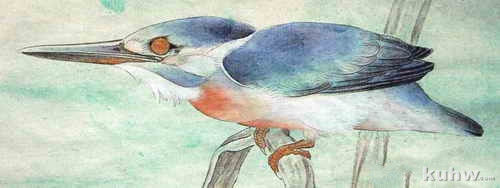 眼平涂朱 色。鸟背部罩染青蓝色(石青+酞青蓝),头部用青蓝色从后枕部位往头顶部位分染。中墨分染飞羽、复羽,留水线。胸、腹部平涂一层白色底色后用朱 在花青色继续分染。爪平涂淡朱 。下颌用淡朱 从根部往尖部分染。